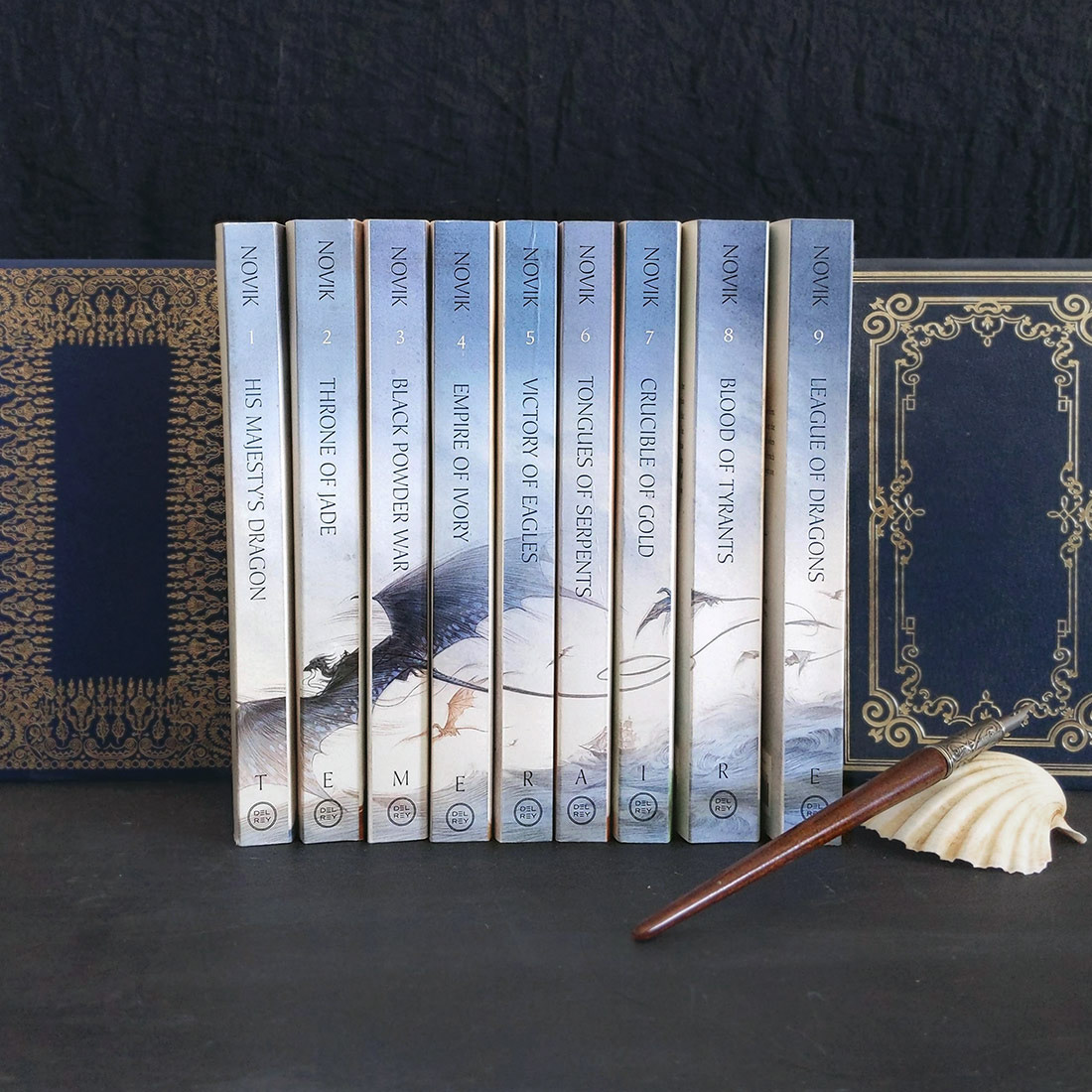 Cover and spine art for trade paperback editions of the Temeraire series by Naomi Novik.